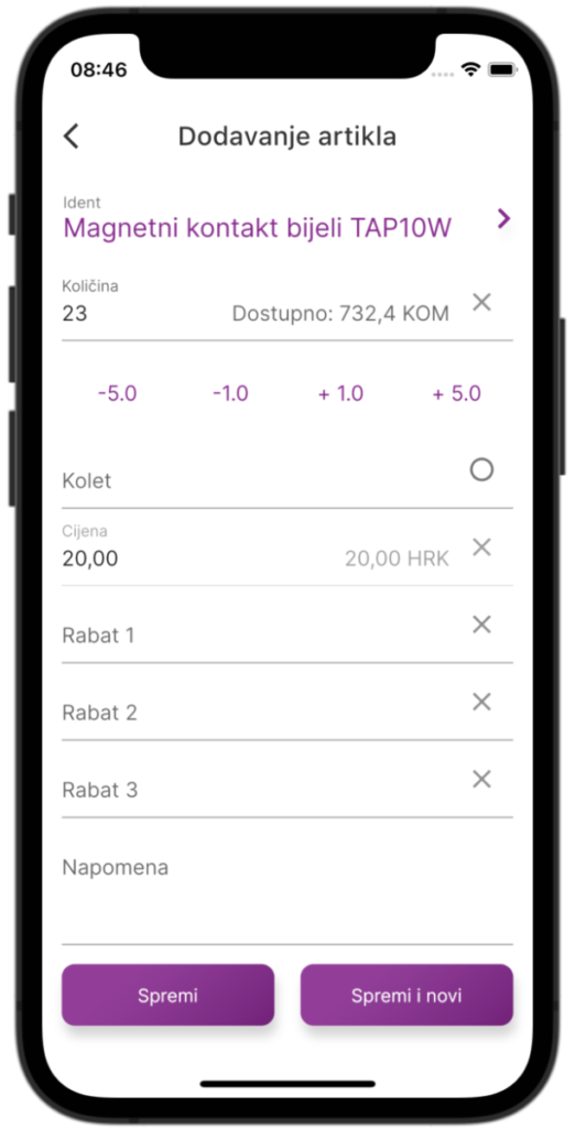 Odabir artikla, unos količine, koleta, cijene, rabata i napomene