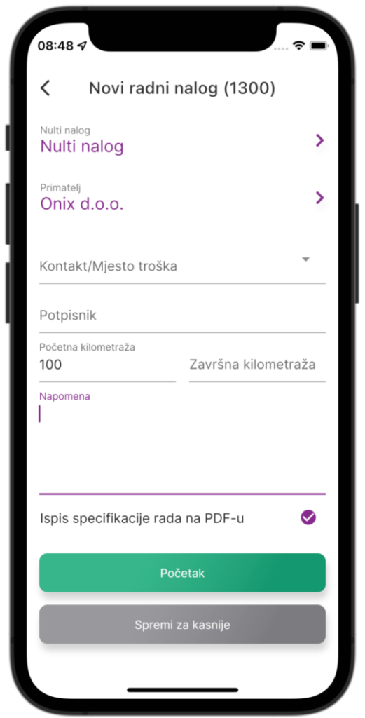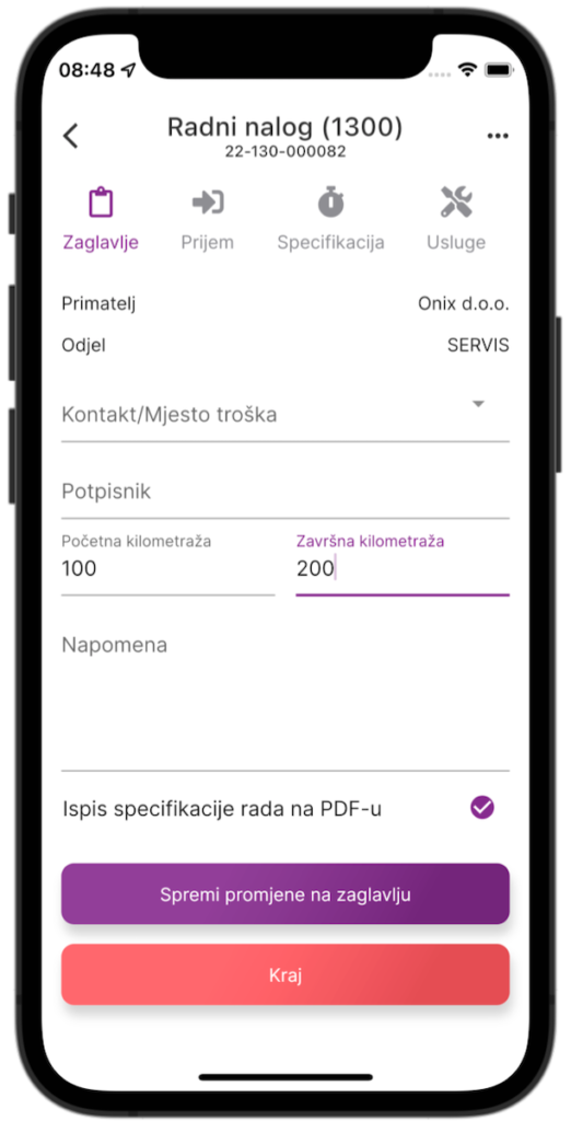 Zaglavlje radnog naloga, odabir radnog naloga iz kojeg će se popuniti osnovni podaci – nulti nalog, odabir primatelja, unos kontakta, potpisnika i kilometraže.